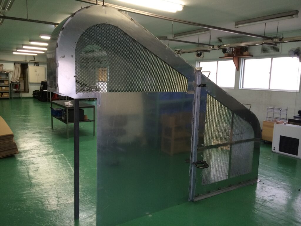 こちらは鉄鋼業界向けのファンカバーです。天面はレーザー加工機で抜き加工を行い、通気性を確保しております。側面はロールベンダーで成形し、溶接を行っております。隙間のない溶接と見栄えが良くなるように研磨をしております。側面に中を確認するための窓を設け、組み立てております。
