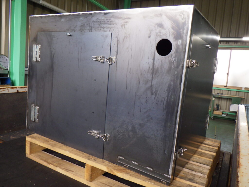 こちらはモーターカバーです。工場で使われるモーターの保護カバーとして用いられます。中を確認できるように2か所蝶番を用いて扉をつけています。耐久性と外観品質を考慮し、特に溶接とその後の仕上げ工程を重要視して、加工しております。