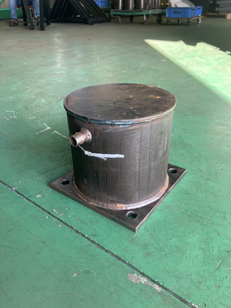 頑丈なパイプ材に手作業で穴あけ加工を行った後、ニップル、自社で加工した板厚9mmの四角形状のフランジ、蓋を溶接して作成いたしました。