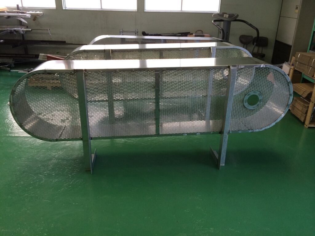 粉体をコンベアで搬送する装置のモーターカバーです。仮組みしたうえで納品させていただきました。レーザー加工機で、2.0㎜のステンレス板材を、特定の形状にカットしたのち、ロール曲げ、ベンダーによる加工部品と溶接を行い、製作いたしました。取り付け位置と組み立てる際のピッチが合っているかに注意して組立を行いました。
