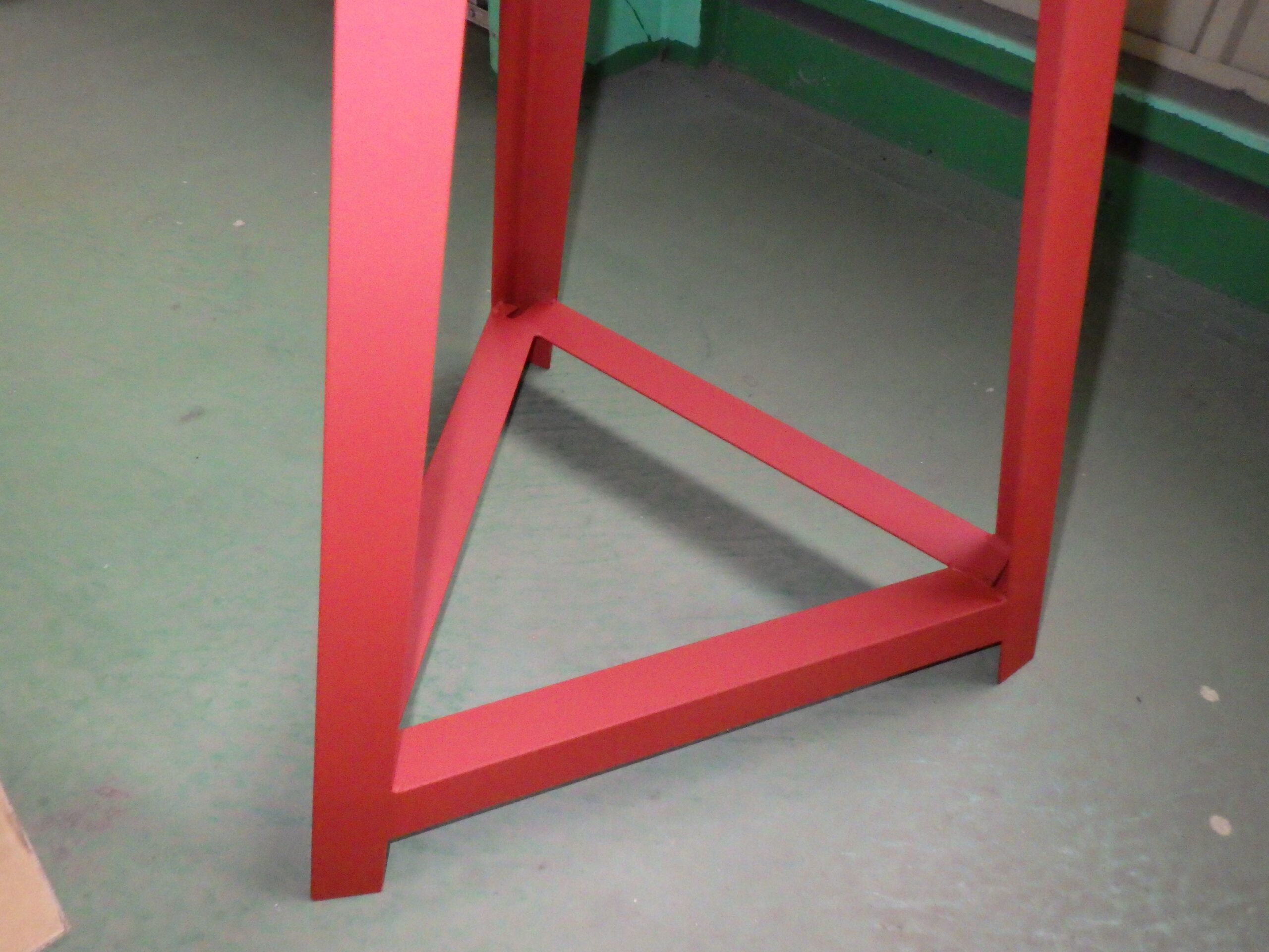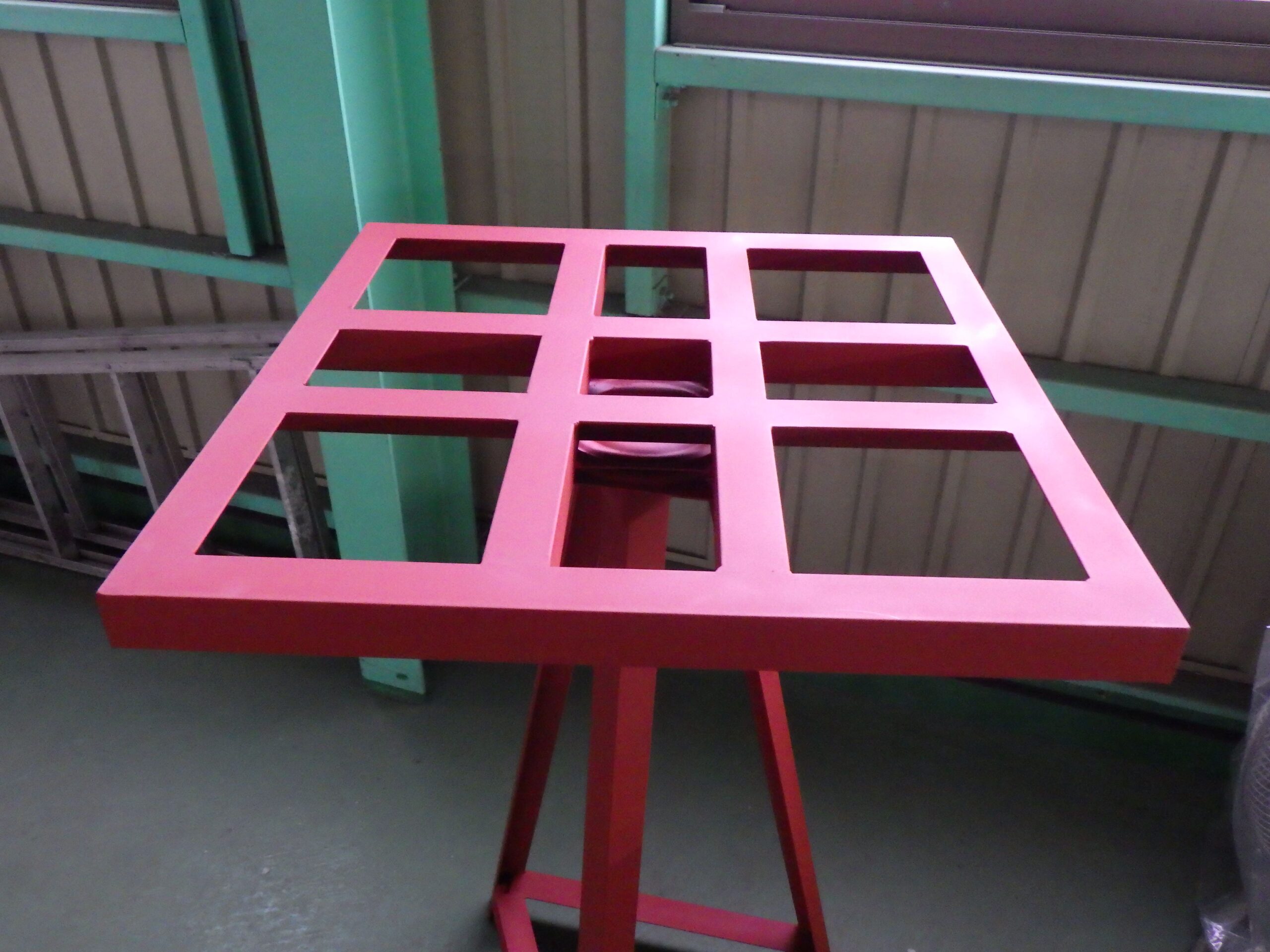 次に、製作工程と仕上げについてです。板厚3mmの鉄を使用し、高さ600mm、天板(エッジ)1000mm、脚部500mmという、安定性と作業性を両立させたサイズで設計されています。 各部材を溶接で強固に接合した後、耐久性を高めるために錆止め塗装を施しました。さらに、作業者が安全に、かつ製品を傷つけずに扱えるよう、溶接部や角(エッジ)をサンダーで滑らかに研磨して仕上げています。